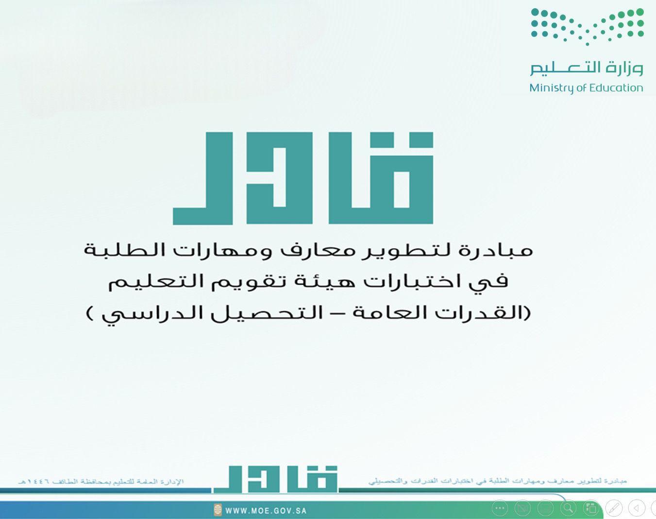 تطلق الإدارة العامة للتعليم بمحافظة الطائف غداً الثلاثاء (مبادرة قادر) 1446 وتهدف مبادرة قادر إلى رفع مستوى أداء الطلاب والطالبات في الاختبارات الوطنية والدولية، وكذلك زيادة المستوى لدى الطلبة في الاختبارات الوطنية والدولية، ونشر ثقافة الاختبارات الوطنية والدولية لدى أولياء الأمور والطلبة.