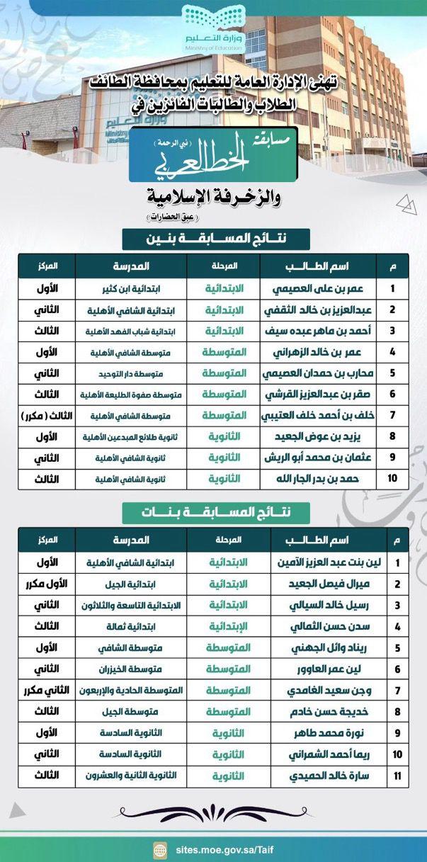 هنأت الإدارة العامة للتعليم بمحافظة الطائف الطلاب والطالبات الفائزين والفائزات في مسابقة الخط العربي “نبي الرحمة” والزخرفة الإسلامية “عبق الحضارات” على مستوى إدارة تعليم الطائف والتي تهدف إلى تنمية مهارات الخط العربي والزخرفة الإسلامية لدى طلاب مدارس التعليم العام بما يتوافق مع رؤية المملكة 2030.”