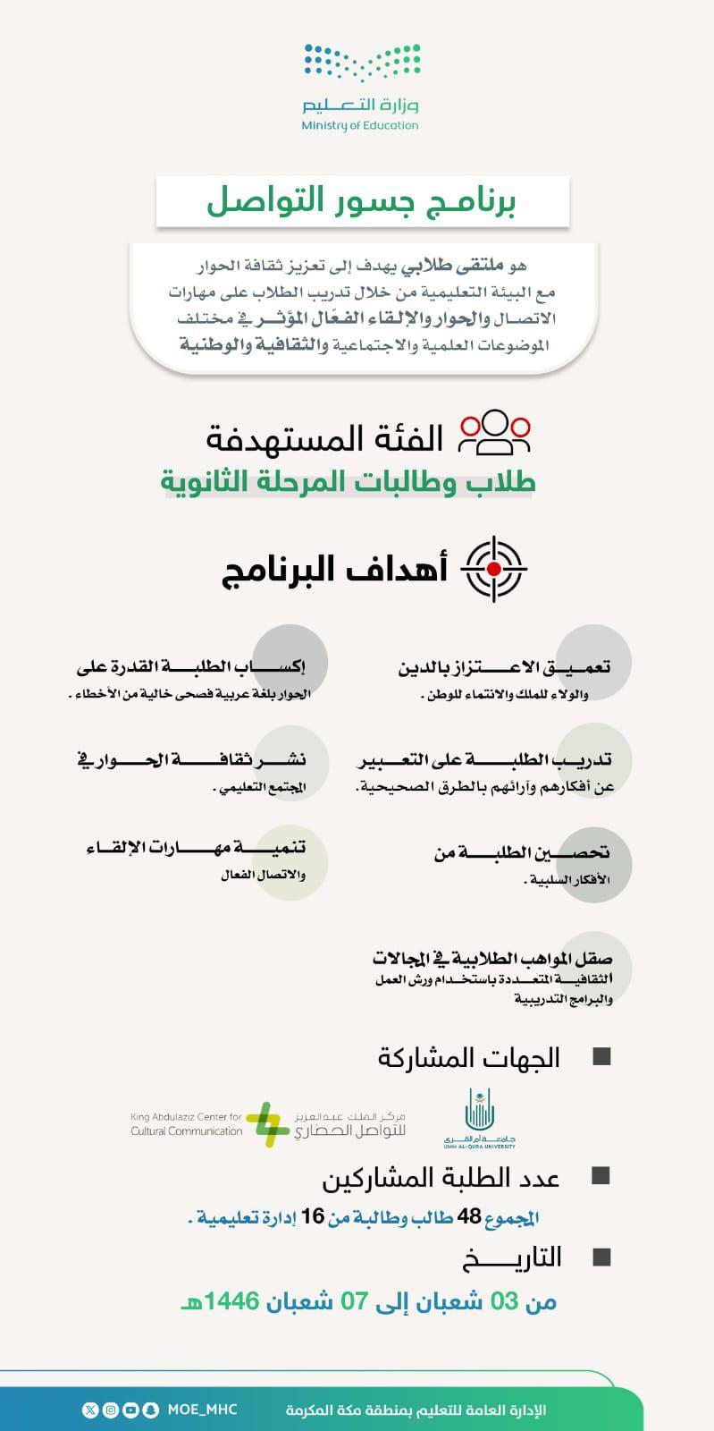 تستضيف الإدارة العامة للتعليم بمنطقة مكة المكرمة خلال الفترة 3-7 شعبان 1446هـ البرنامج الوزاري جسور التواصل وذلك بالتعاون مع مركز الملك عبدالعزيز للتواصل الحضاري ، وجامعة أم القرى.