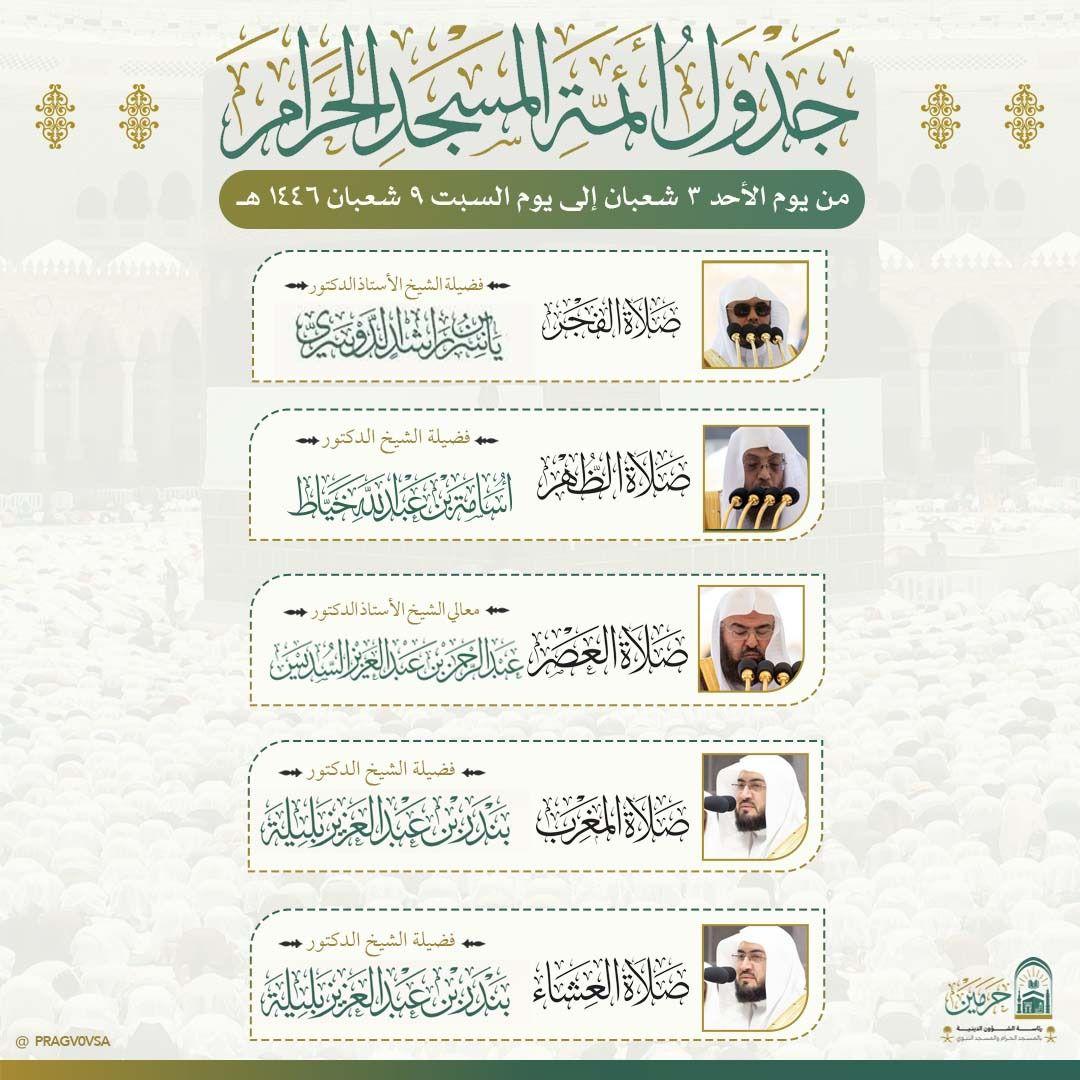 وذلك بهدف تنظيم الصلوات وتيسير العبادة للمصلين في أجواء من الخشوع والسكينة حيث تضمن جدول أئمة المسجد الحرام لصلاة الفجر فضيلة الشيخ الاستاذ الدكتور ياسر الدوسري وصلاة الظهر فضيلة الشيخ الدكتور أسامة خياط وصلاة العصر معالي الشيخ الأستاذ الدكتور عبدالرحمن السديس وصلاة المغرب والعشاء فضيلة الشيخ الدكتور بندر بليلة.