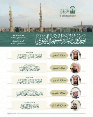 أما في المسجد النبوي فسيؤم المصلين في صلاة الفجر فضيلة الشيخ أحمد بن حميد ولصلاة الظهر فضيلة الشيخ الدكتور خالد المهنا وصلاة العصر فضيلة الشيخ أحمد بن حميد وصلاة المغرب فضيلة الشيخ الدكتور عبدالمحسن القاسم وصلاة العشاء فضيلة الشيخ الدكتور أحمد الحذيفي.