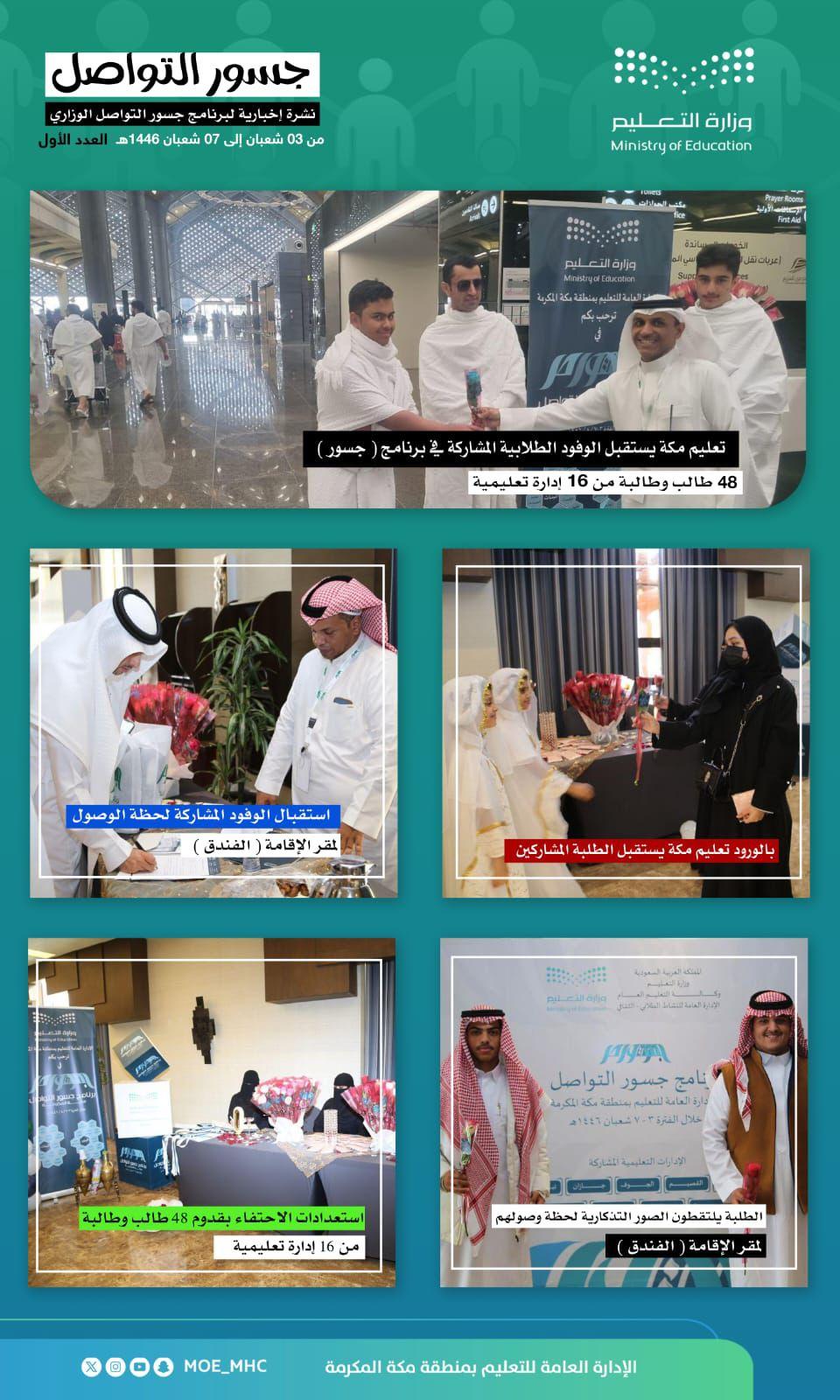 بدأت اليوم الأحد الثالث من شعبان 1446 هـ ؛ وصول الوفود المشاركة في برنامج ” جسور التواصل ” حيث يشارك فيه 48 طالب وطالبة من 16 إدارة تعليمية والذي تنظمه الإدارة العامة للتعليم بمنطقة مكة المكرمة بالتعاون مع مركز الملك عبدالعزيز للتواصل الحضاري ، وجامعة أم القرى ويستمر حتى السابع من الشهر نفسه وذلك لتعزيز ثقافة الحوار في المجتمع التعليمي. فيما تبدأ صباح غد الاثنين فعاليات البرنامج بعرض أوراق العمل المعدة من قبل المشاركين في مواضيع الاتصال الثقافي والحضاري.