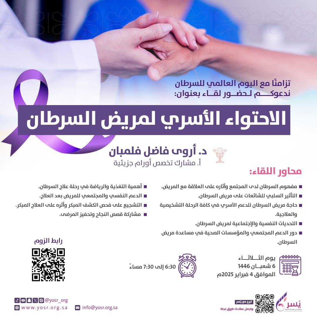 ضمن الأنشطة والبرامج والفعاليات والمبادرات التي تقوم بها جمعية يسر للتنمية الأسرية بمكة المكرمة َوتزامنا مع اليوم العالمي للسرطان نظمت الجمعية لقاء بعنوان : (الإحتواء الأسري لمريض السرطان).