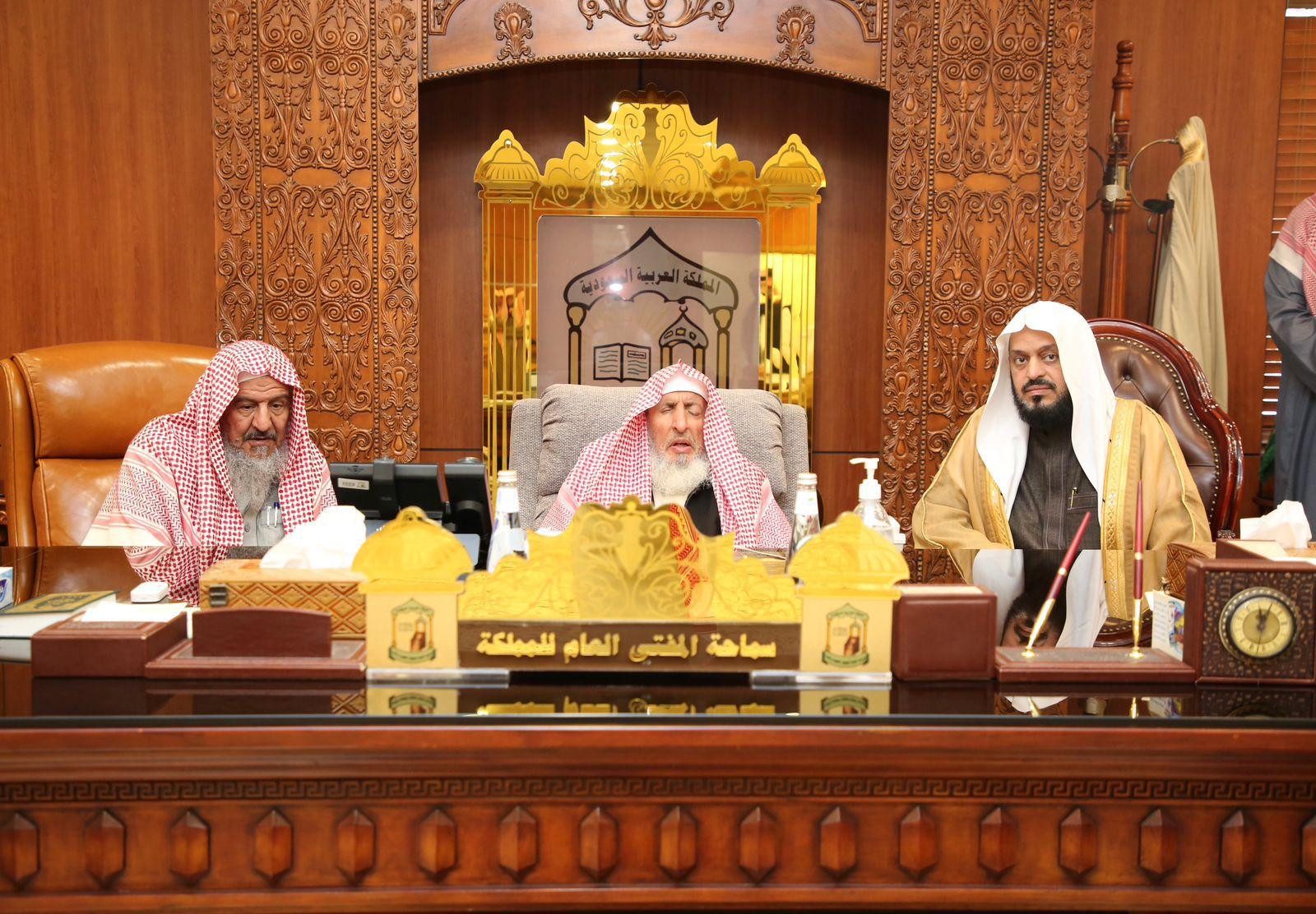 استقبل سماحة مفتي عام المملكة رئيس هيئة كبار العلماء رئيس اللجنة الدائمة للبحوث العلمية والإفتاء الشيخ عبدالعزيز بن عبدالله بن محمد آل الشيخ , اليوم الأربعاء في مكتبه بمقر الرئاسة بالرياض، الدكتور خالد بن حمد الخالدي المشرف على وحدة التوعية الفكرية بجامعة الملك فيصل ووفدا طلابيا من كلية الشريعة بالجامعة ، ضمن برنامج الزيارات اليومية لسماحته لاستقبال الوفود والاستماع للاستفسارات والرد على الفتاوى.