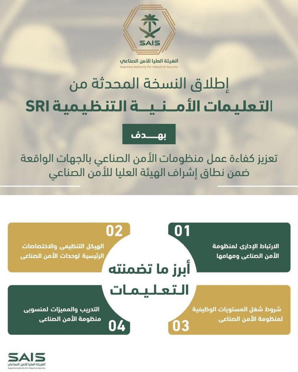 أطلقت الهيئة العليا للأمن الصناعي النسخة المحدثة من التعليمات الأمنية التنظيمية (SRI) التي تهدف إلى تعزيز كفاءة عمل منظومات الأمن الصناعي بالجهات الواقعة ضمن نطاق إشراف الهيئة.
