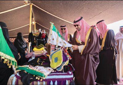 وزار سموه فور وصوله الخيمة الشعبية التي تشارك بها مجموعة من الأسر، كما اطلع على جناح الفريق التطوعي بالمدارس وتجول في المعرض الفني الذي تضمن على العديد من المجسمات واللوحات الفنية عن هذه المناسبة التاريخية.