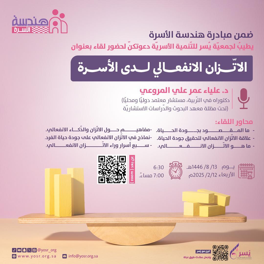 ضمن الأنشطة والبرامج والفعاليات والمبادرات التي تقوم بها جمعية يسر للتنمية الأسرية بمكة المكرمة وضمن مبادرة هندسة الأسرة: تقيم الجمعية لقاء بعنوان (الاتّزان الانفعالي لدى الأسرة).