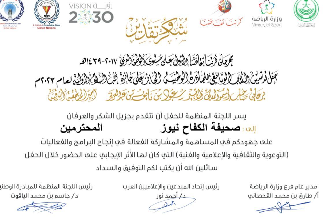 مهرجان كرتنا ثقافنا الأول على مستوى الوطن العربي يكرم صحيفة الكفاح نيوز اعلى جهودها والمساهمة والمشاركة الفعالة في إنجاح البرامج والفعاليات التوعوية والثقافية والإعلامية والفنية التي لها الأثر الإيجابي على الحضور خلال الحفل.