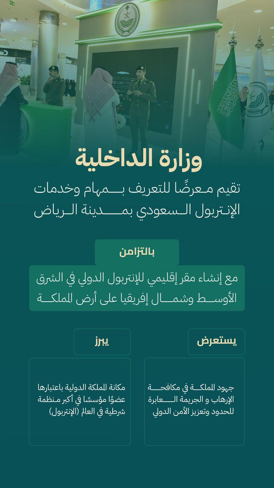 تواصل وزارة الداخلية معرضها التعريفي بمهام الإنتربول السعودي؛ لتعزيز الوعي بدور المملكة في مكافحة الجريمة والإرهاب على المستوى الدولي، الذي يستمر حتى (17 فبراير 2025م)، في مجمع الرياض بارك بمدينة الرياض.