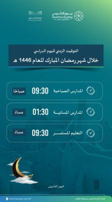 أعتمد المدير العام للتعليم بالطائف الدكتور سعيد بن عبدالله الغامدي التوقيت الزمني لبدء اليوم الدراسي خلال رمضان لعام 1446 للمدارس في المحافظة والمحافظات والمراكز التابعة لها تعليمياً حيث سيكون دوام المدارس الصباحية يبدأ الساعة 9:30 صباحاً، والمسائية 1:30 مساءً والتعليم المستمر 9:30 مساءً متمنياً للجميع التوفيق والسداد.