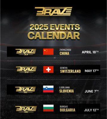 أعلنت منظمة بريف الدولية لفنون القتال المختلطة عن البرنامج الزمني لبطولاتها في عام ٢٠٢٥م وستقام أولى بطولات بريف الدولية وفقا للبرنامج الزمني في الصين في ١٨ ابريل المقبل بينما تقام البطولة الدولية الثانية في سويسرا في ١٧ مايو المقبل وستقام البطولة الثالثة في سلوفينيا في ٧ يونيو اما البطولة الرابعة فتقرر ان تقام في بلغاريا في ١٢ يوليو المقبل.. وتعتبر سلسلة بطولات منظمة بريف الدولية لعام ٢٠٢٥. امتداد لنشاطها الدولي منذ تأسيسها والذي أقيم في عدة نسخ متتالية لفنون القتال.