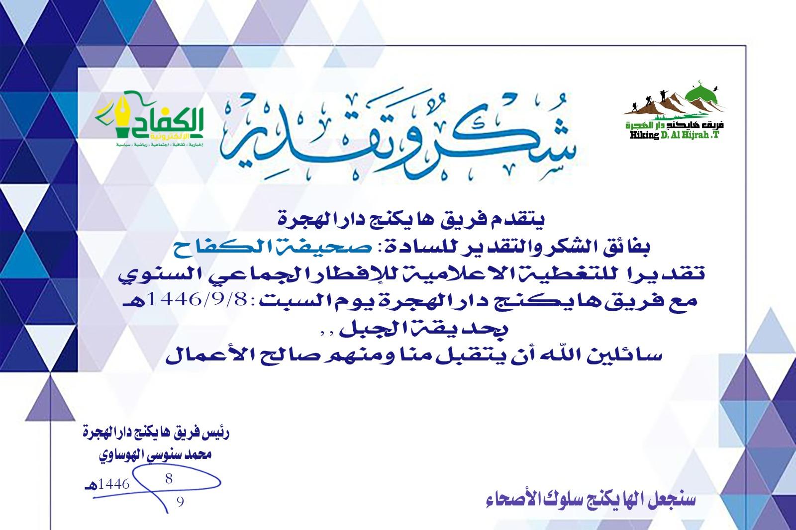 تكريم – صحيفة الكفاح نيوز بشاهدة شكر وتقدير من فريق هايكنج دار الهجرة لتعاونها في الإفطار الجماعي السنوى مع فريق هايكنج دار الهجرة يوم السبت 8-9-1446 بحديقة الجبل.