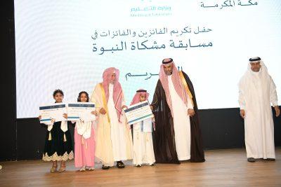 برعاية معالي الشيخ الدكتور صالح بن حميد. نظمت الإدارة العامة للتعليم بمنطقة مكة المكرمة الحفل الختامي لتكريم الفائزين والفائزات في مسابقة السنة النبوية “مشكاة النبوة” لعام 1446 هـ، حيث رحب المدير العام للتعليم بمنطقة مكة المكرمة الأستاذ عبدالله بن سعد الغنام خلال كلمته بمعالي الشيخ الدكتور صالح بن عبدالله بن حميد وأصحاب الفضيلة والسعادة والضيوف الكرام وبأبنائه وبناته الطلاب والطالبات، مؤكدًا بأنه لشرف عظيم أن يلتقي الجميع اليوم في هذا الحفل المبارك، الذي يأتي تتويجًا لجهود عظيمة بُذلت في خدمة سنة النبي الكريم صلى الله عليه وسلم من خلال هذه المسابقة المباركة، مسابقة السنة النبوية “مشكاة النبوة”، والتي تهدف إلى غرس القيم النبوية في نفوس أبنائنا وبناتنا، وتنمية ارتباطهم بسنة المصطفى عليه السلام علمًا وعملًا وسلوكًا.