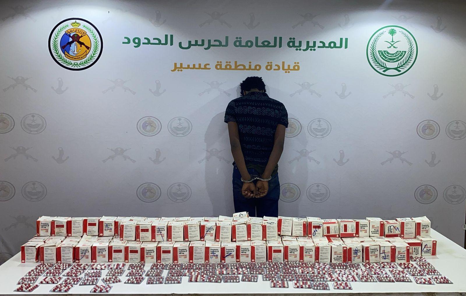 قبضت الدوريات البرية لحرس الحدود في قطاع الربوعة بمنطقة عسير على مخالف لنظام أمن الحدود من الجنسية الإثيوبية، لتهريبه (32,700) قرص خاضع لتنظيم التداول الطبي، وجرى استكمال الإجراءات النظامية الأولية بحقه، وتسليمه والمضبوطات لجهة الاختصاص.