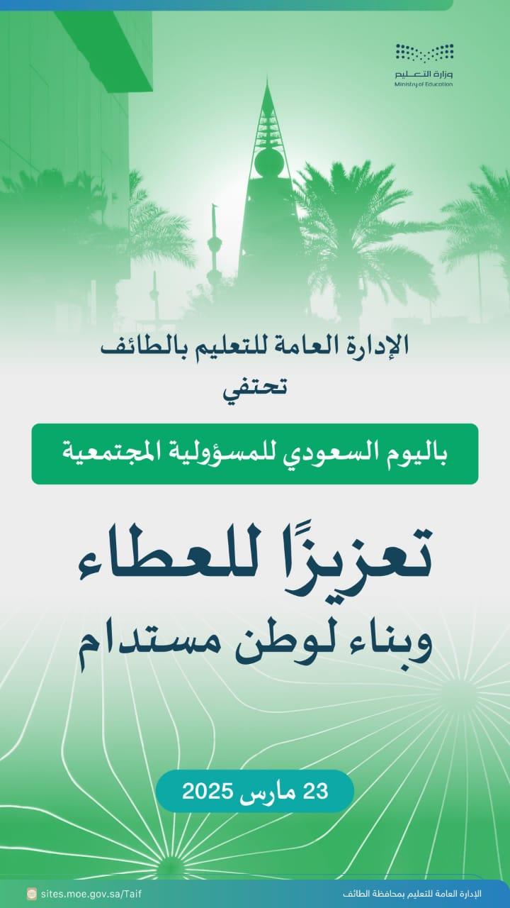 شاركت الإدارة العامة للتعليم بالطائف في الاحتفاء باليوم السعودي للمسؤولية الاجتماعية وعززت الإدارة ذلك من خلال شراكات فاعلة وأثرٍ مستدام، أكثر من 10 شراكةً مجتمعية، ذات أثر تعليمي، اجتماعي وثقافي ، فضلاً عن بث رسائل هادفة تعزز المسؤولية المجتمعية والعمل التطوعي.