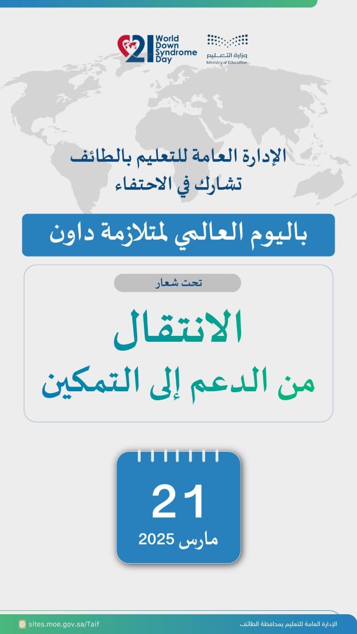 احتفت الإدارة العامة للتعليم بالطائف بفعاليات اليوم العالمي لمتلازمة داون، تحت شعار “الانتقال من الدعم إلى التمكين” من خلال التوعية بهذه الفئة، فضلاً عن الوقوف والتعريف بقدرات ومهارات هؤلاء الطلبة والخدمات التي تقدمها وزارة التعليم تجاههم.