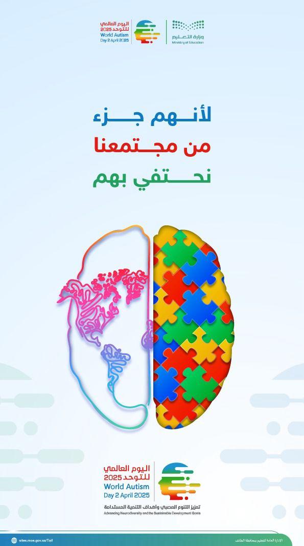 شاركت الإدارة العامة للتعليم في الطائف في الاحتفاء بمناسبة ” اليوم العالمي للتوحد” ، الذي يصادف الثاني من شهر أبريل من كل عام ، من خلال بث رسائل اتصالية عبر حساباتها الرسمية.