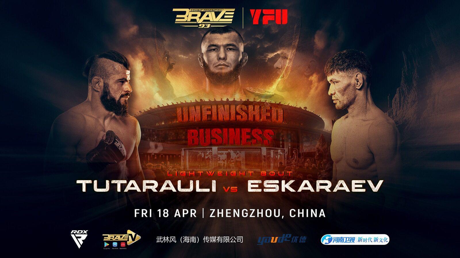 ويشهد الحدث الرئيسي لبطولة BRAVE CF 93 نزالا يجمع بين أبرز منافسي الوزن الخفيف في أوراسيا، حيث يواجه المقاتل الجورجي راولي توتارولي خصمه المقاتل الكازاخستاني أولزهاس إسكاراييف، في نزال يتوقع أن يشهد الحماس والإثارة، خصوصا وأنهما يسعيان للحصول على فرصة الفوز باللقب العالمي للفوز الخفيف.