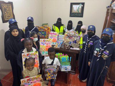 حيث قدم فريق سواعد الحي التطوعي الهدايا للأبناء ، وكذلك وفر فريق مرشدات مكة المكرمة الكشفي الهدايا المتنوعة والشكولاتة والحلوى المختلفة.