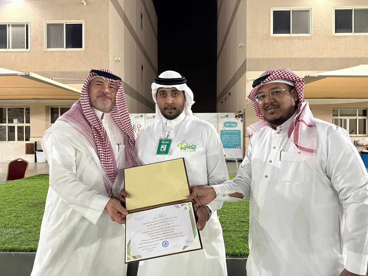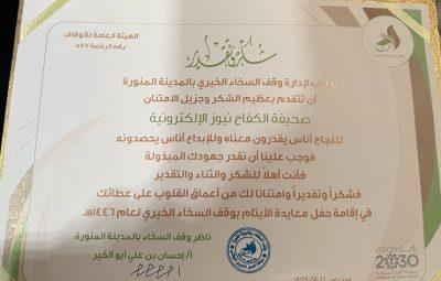 وقف السخاء الخيري بالمدينة المنورة يكرم صحيفة الكفاح نيوز ،بشهادة شكر وتقدير على جهودها في نشر وتغطيات مناسبات الوقف ،جاء ذلك في حفل المعايدة الذي نظمة وقف السخاء الخيري مساء الجمعة 13-10-1446 ،حيث قام بتسليم شهادة التكريم الأستاذ – حامد الحمزاني مسؤول العلاقات العامة والإعلام بوقف السخاء الخيري ،بحضور الأستاذ – فريد أبو الخير متطوع في وقف السخاء الخيري.