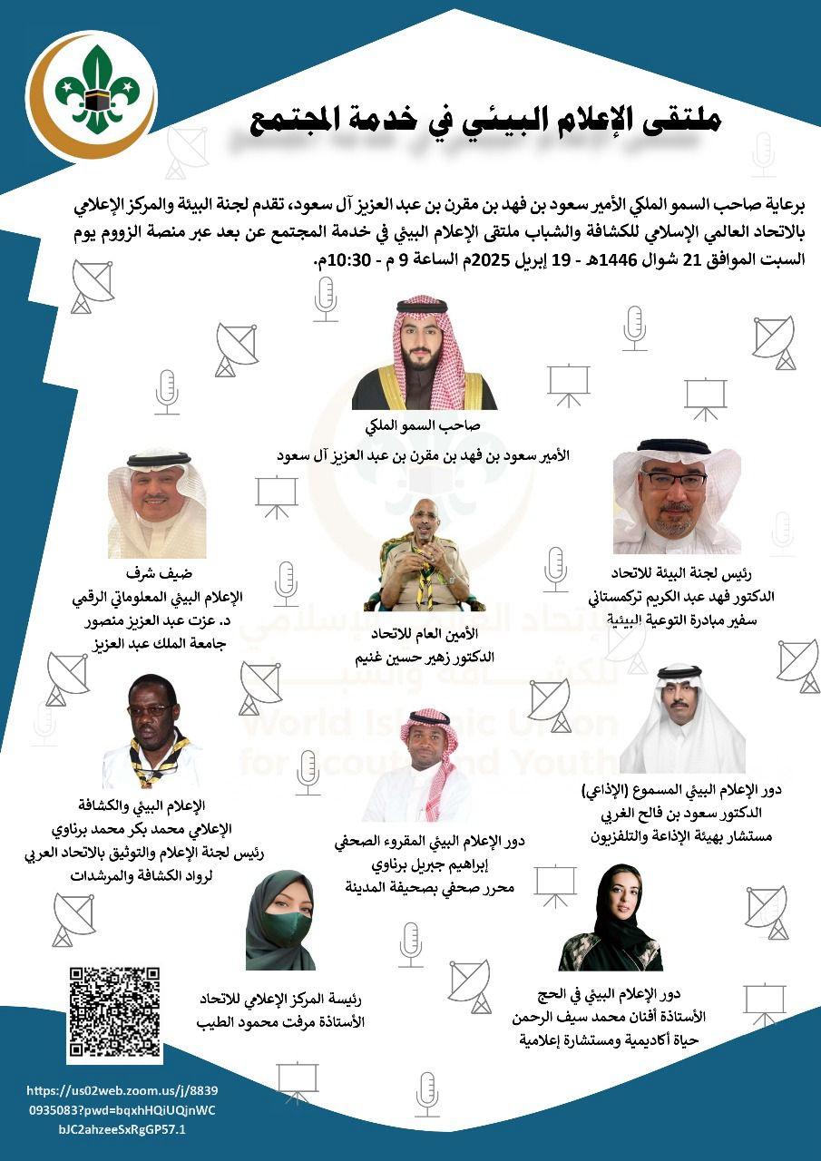 برعاية صاحب السمو الملكي الأمير سعود بن فهد بن مقرن بن عبدالعزيز – نظم الإتحاد العالمي الإسلامي للكشافة والشباب ممثلاً باللجنة البيئية والمركز الإعلامي للإتحاد ملتقى عن بعد عبر منصة الزووم بعنوان (الإعلام البيئي في خدمة المجتمع).