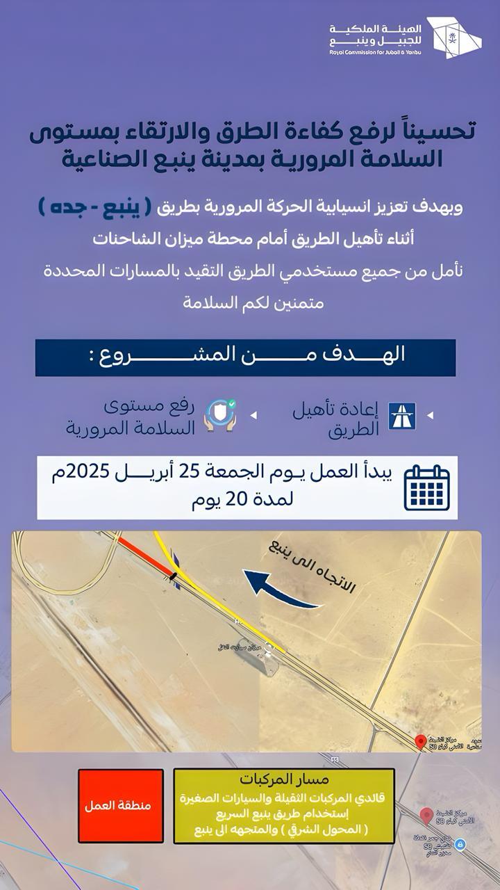حرصاً على سلامة مرتادي الطريق، وبالتنسيق مع إدارة مرور محافظة ينبع، نود التنويه بأنه سيتم إغلاق الطريق المتجه إلى ينبع الصناعية بعد مركز الضبط الأمني (ك 50)، وذلك لبدء أعمال تحسينية للطريق، اعتباراً من اليوم الجمعة 25 أبريل 2025م، ولمدة 20 يوماً.