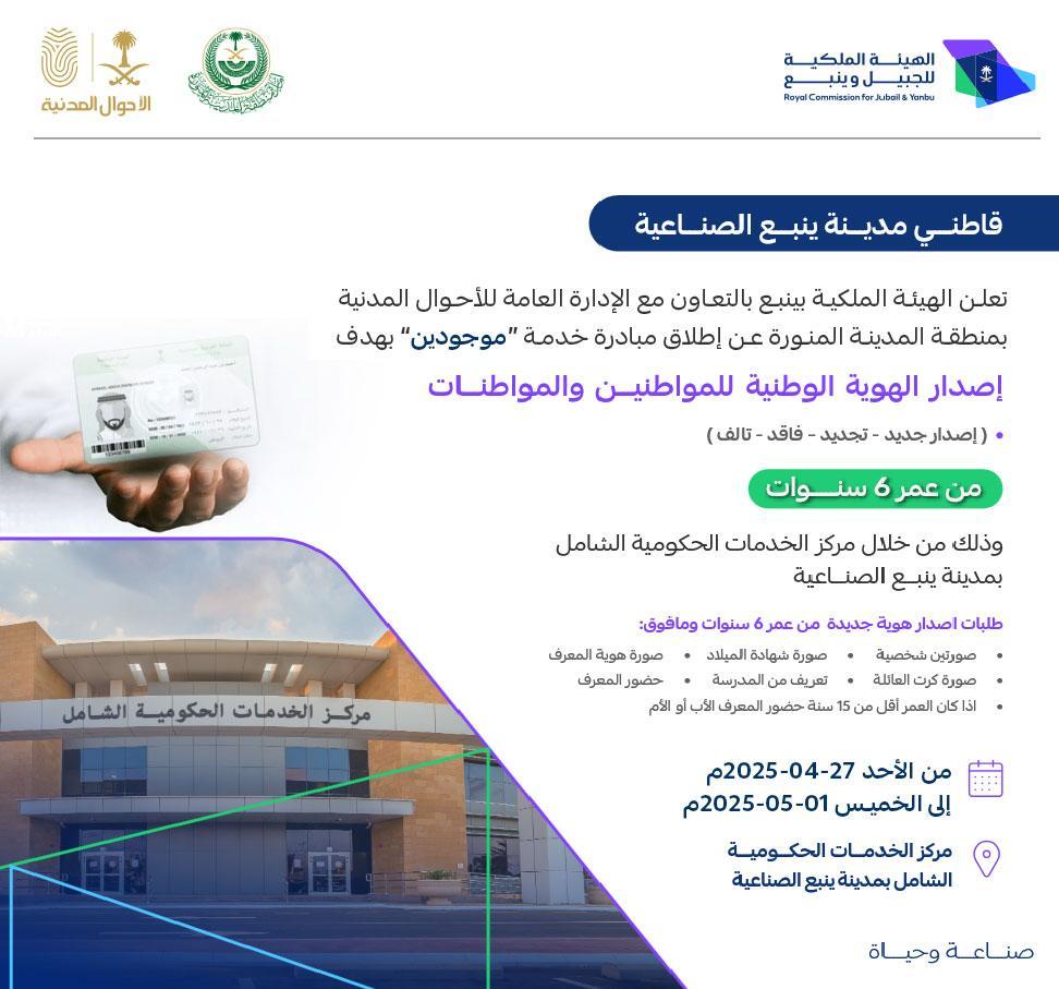 تعلن الهيئة الملكية بينبع بالتعاون مع الادارة العامة للأحوال المدنية بمنطقة المدينة المنورة عن إتاحة خدمة الإصدار والتجديد للهوية الوطنية للمواطنين والمواطنات مركز الخدمات الحكومية الشامل بمدينة ينبع الصناعية من الأحد 27 أبريل إلى الخميس 1 مايو 2025م وفي المرفق مزيد من التفاصيل.
