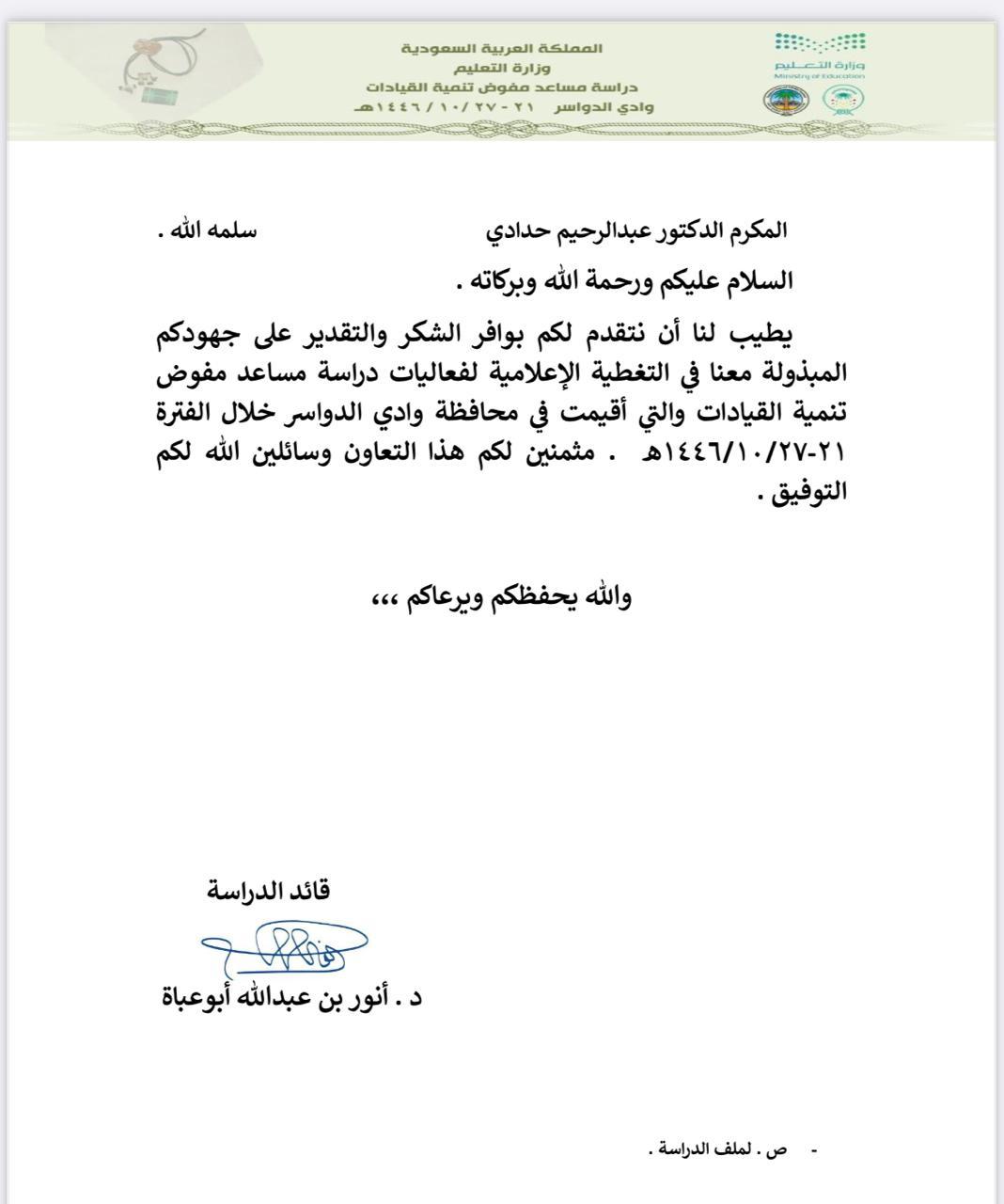 وزارة التعليم ممشله في دراسة مساعد مفوض تنمية القيادات – تكرم رئيس التحرير الدكتور – عبدالرحيم الحدادي بخطاب رسمي جاء فيه.