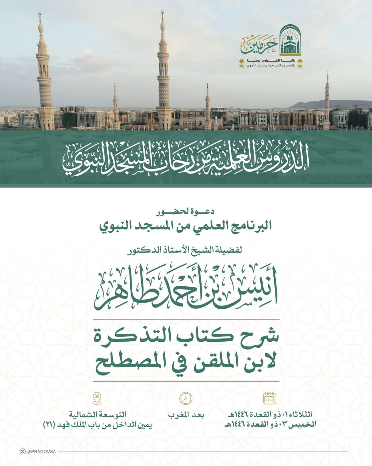 في إطار جهودها المستمرة لنشر العلم الشرعي وترسيخ الفهم الصحيح للنصوص الدينية، تطلق رئاسة الشؤون الدينية بالمسجد الحرام والمسجد النبوي برنامجًا علميًا مميزًا في رحاب المسجد النبوي الشريف، يقدمه فضيلة الشيخ الأستاذ الدكتور أنيس بن محمد طاهر.