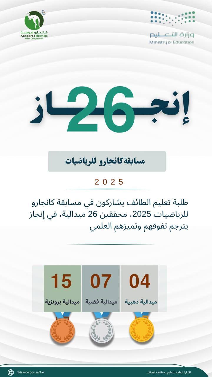 سجّل طلاب وطالبات الإدارة العامة للتعليم بمحافظة الطائف حضورًا لافتًا في مسابقة كانجارو العالمية للرياضيات 2025، وذلك بحصولهم على 26 ميدالية في إنجاز علمي جديد يُضاف لسجل التعليم بالمحافظة.