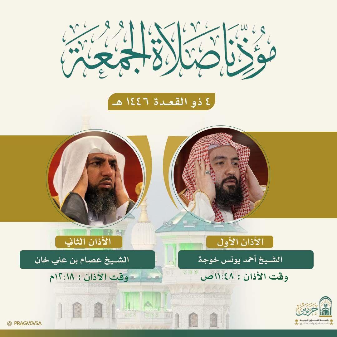 أوضحت رئاسة الشؤون الدينية بالمسجد الحرام والمسجد النبوي أسماء المؤذنين لصلاة الجمعة الموافق 4 ذي القعدة 1446هـ، وذلك ضمن جهودها المستمرة في تنظيم أوقات الصلاة، وإعلام قاصدي وزوّار الحرمين الشريفين بمواعيد الأذان والمؤذنين المكلفين في المسجد الحرام بمكة المكرمة: الأذان الأول: فضيلة الشيخ أحمد يونس خوجة – الساعة 11:48 صباحًا الأذان الثاني: فضيلة الشيخ الدكتور عصام خان – الساعة 12:18 مساءً وفي المسجد النبوي بالمدينة المنورة: الأذان الأول: فضيلة الشيخ حسن خاشقجي – الساعة 11:49 صباحًا الأذان الثاني: فضيلة الشيخ أنس الشريف – الساعة 12:19 مساءً.