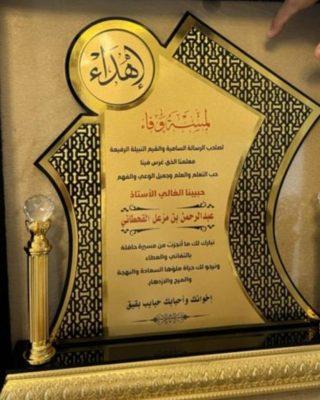 وذلك بمناسبة تقاعده من العمل ومناسبة نزالته لبيته العامر الجديد، وقدموا للأستاذ – عبدالرحمن القحطاني درع تذكاري بهذه المناسبة، والتقطت الصور التذكارية.