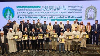 وفي ختام الحفل، أُعلن عن أسماء الفائزين في فروع المسابقة الخمسة، وتم تكريمهم من قبل سعادة سفير خادم الحرمين الشريفين لدى جمهورية ألبانيا وغير المقيم في كوسوفو الأستاذ فيصل بن غازي حفظي، وفضيلة رئيس المشيخة الإسلامية ومفتي جمهورية كوسوفا الشيخ نعيم ترنافا، وفضيلة إمام وخطيب المسجد الحرام الشيخ الدكتور بندر بن عبدالعزيز بليلة، وفضيلة الملحق الديني بسفارة المملكة في البوسنة والهرسك الشيخ عامر بن بنوان العنزي، حيث قُدمت لهم جوائز مالية تجاوزت نصف مليون ريال سعودي.
