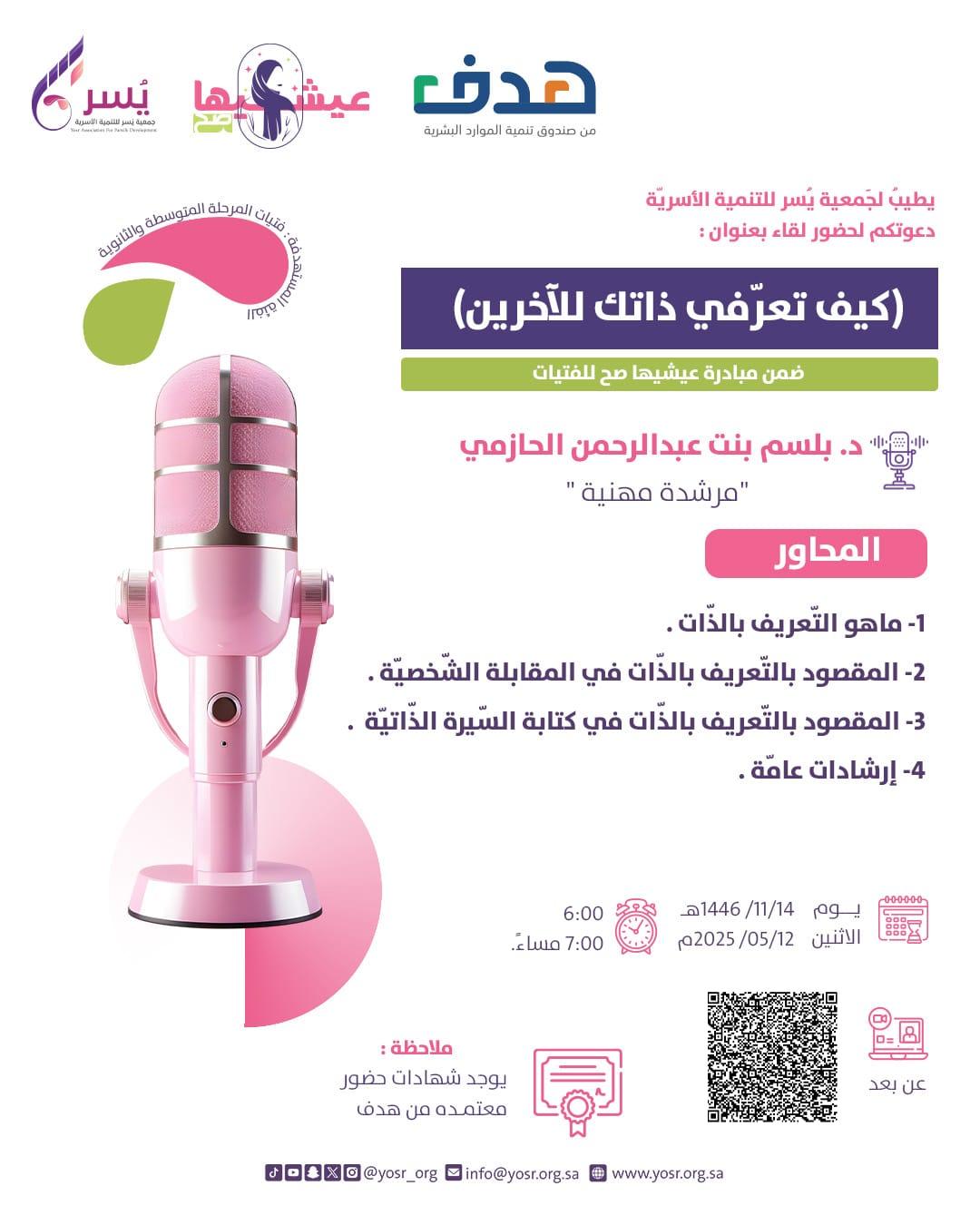 وأضافت الدكتورة هيفاء فدا بأن اللقاء من تقديم: الدكتورة بلسم بنت عبدالرحمن الحازمي ” مرشدة مهنية” ويقام اللقاء مساء يوم اليوم الاثنين : ١٤/ ١١/ ١٤٤٦هـ الموافق: ١٢ مايو ، ٢٠٢٥م ويبدأ اللقاء من الساعة ٥:٠٠ عصرا – ولمدة ساعتين حتى الساعة ٧:٠٠ مساء.