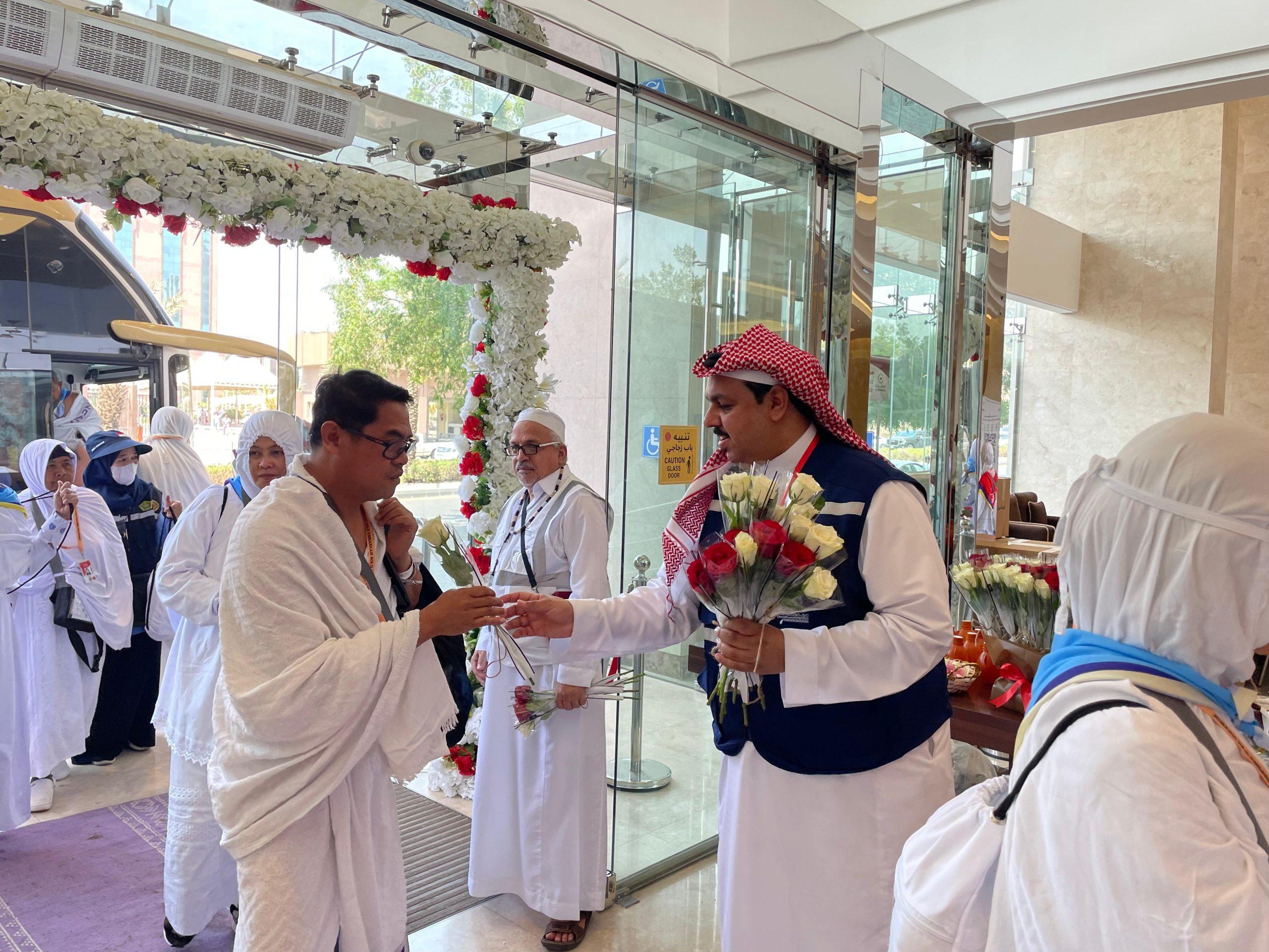 بماء زمزم المبارك و باقات الورود استقبل مركز الضيافة 102 لخدمات الحجاج فوجاً من حجاج أندونيسيا القادمين لأداء مناسك الحج هذا العام.