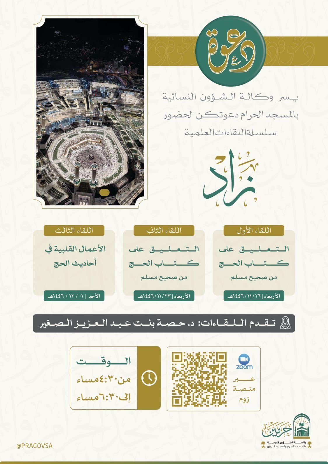 أطلقت وكالة الشؤون النسائية بالمسجد الحرام مبادرة “زاد” العلمية؛ لإثراء تجربة القاصدات في موسم حج 1446هـ، وفق الخطة التشغيلية للرئاسة وتتضمن مبادرة “زاد” شرحًا لكتاب الحج من “صحيح الإمام مسلم” -رحمه الله-؛ وذلك عبر سلسلة دروس علمية منهجية مؤصلة، تهدف إلى نشر المنهج الإسلامي المعتدل، المبني على الفهم الصحيح لكتاب الله وسنة رسول الله ﷺ.