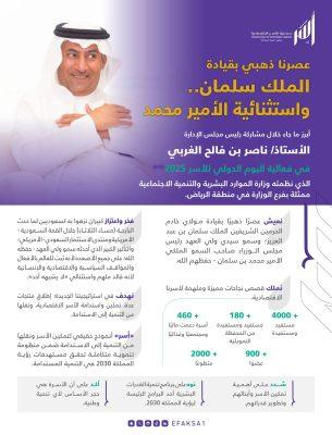 مشيرًا إلى أن الأسرة هي حجر الأساس لأي تنمية وطنية، ولدينا في جمعية “أُسر” نماذج حقيقية لتمكين الأسر ونقلها من التنمية إلى الاستدامة، حيث بلغ عدد المستفيدين أكثر من 4000 مستفيد ومستفيدة، أكثر من 180 مستفيد ومستفيدة من المحفظة التمويلية، أكثر من 460 أسرة دُعمت ماليًا ومجتمعيًا، أكثر من 900 عضوًا، وأكثر من 2000 متطوعًا، وذلك ضمن منظومة تنموية متكاملة تحقق مستهدفات رؤية 2030 في التنمية المستدامة.