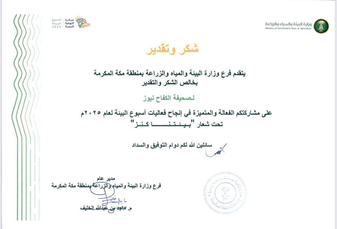 كرمت فرع وزارة البيئة والمياه والزراعة ،بمنطقة مكة المكرمة – صحيفة الكفاح نيوز ،بشهادة شكر وتقدير ،على مشاركتها الفعالة والمتميزة ،في إنجاح فعاليات أسبوع البيئة 2025 ،تحت شعار بيئتنا كنز.