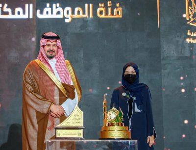كما كرّم سمو أمير المنطقة الفائزين بجائزة الموظف المتميز في دورتها الأولى في القطاعين المدني والأمني، ففي القطاع المدني فاز الأستاذ فهد بن عوادة الجهني من الإدارة العامة للتعليم بالمنطقة في فئة المشرف، بينما نالت الأستاذة أماني بنت فلاح الحربي من إدارة الأحوال المدنية جائزة فئة المختص، وحازت الدكتورة داليا بنت عدنان يغمور من فرع وزارة الموارد البشرية والتنمية الاجتماعية جائزة فئة الموظف المكتبي، أما فئة الموظف الميداني فذهبت إلى المهندس عمار بن منصور العمران من وكالة وزارة الحج والعمرة لشؤون الزيارة، وإلى الأستاذ فهد بن لويبان الرشيدي من فرع وزارة الموارد البشرية والتنمية الاجتماعية.