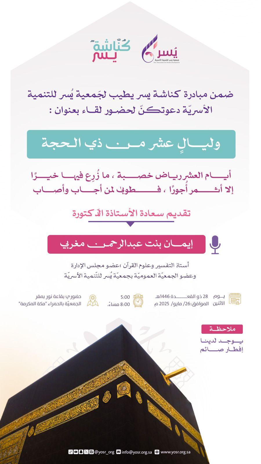 ضمن الأنشطة والبرامج والفعاليات التي تقوم بها جمعية يسر للتنمية الأسريّة بمكة المكرمة وضمن مبادرة( كُنّاشة يُسر) تقيم الجمعية لقاء بعنوان : (وليالٍ عشر ).