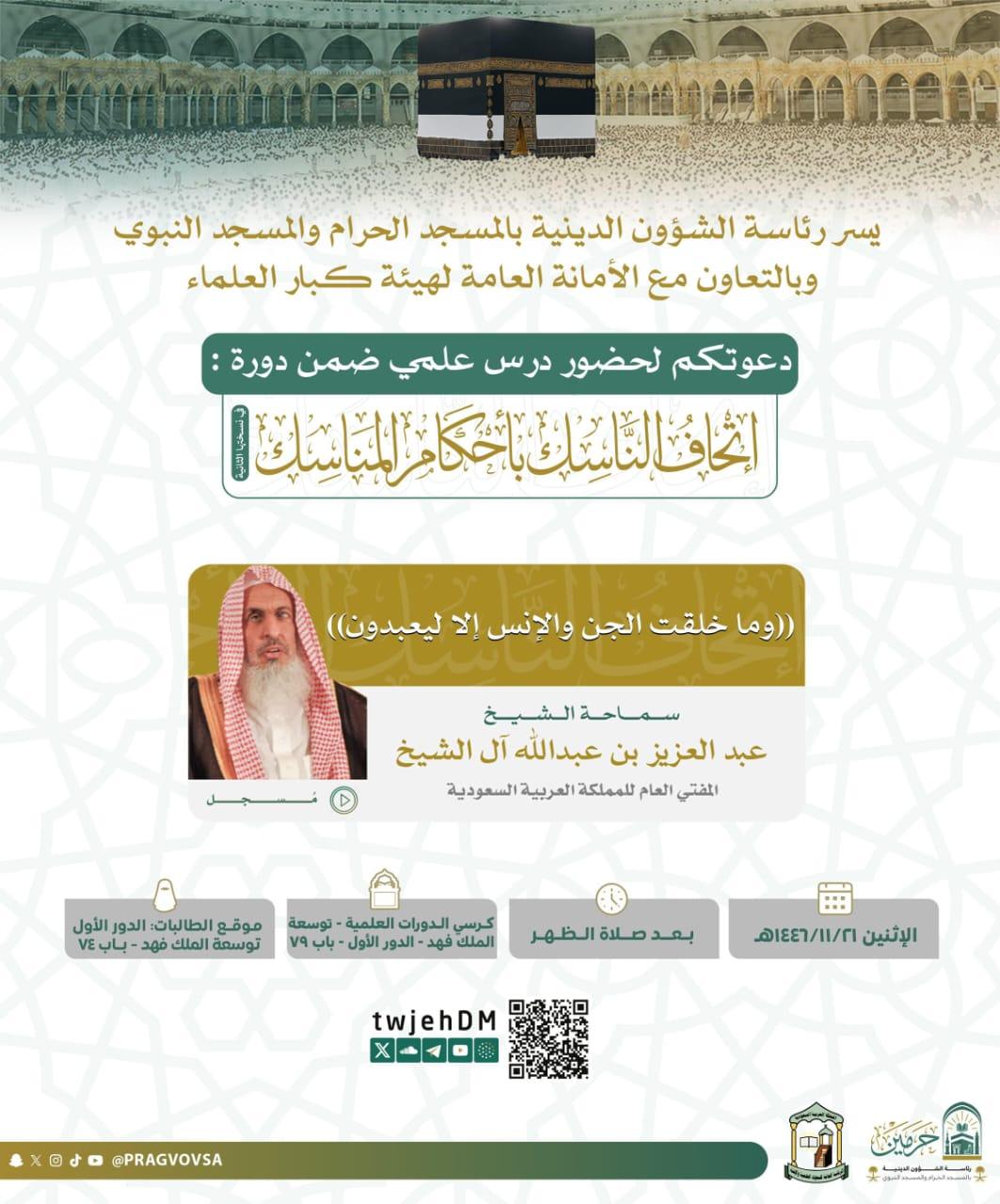 وكان سماحة المفتي العام للمملكة رئيس هيئة كبار العلماء الرئيس العام للبحوث العلمية والإفتاء الشيخ عبدالعزيز بن عبدالله بن محمد آل الشيخ قد افتتح الدورة العلمية الكبرى «إتحاف الناسك بأحكام المناسك» في المسجد الحرام، التي أطلقتها رئاسة الشؤون الدينية بالمسجد الحرام والمسجد النبوي بالتعاون مع الأمانة العامة لهيئة كبار العلماء خلال الفترة من 19 ذي القعدة إلى 5 ذي الحجة 1446هـ.