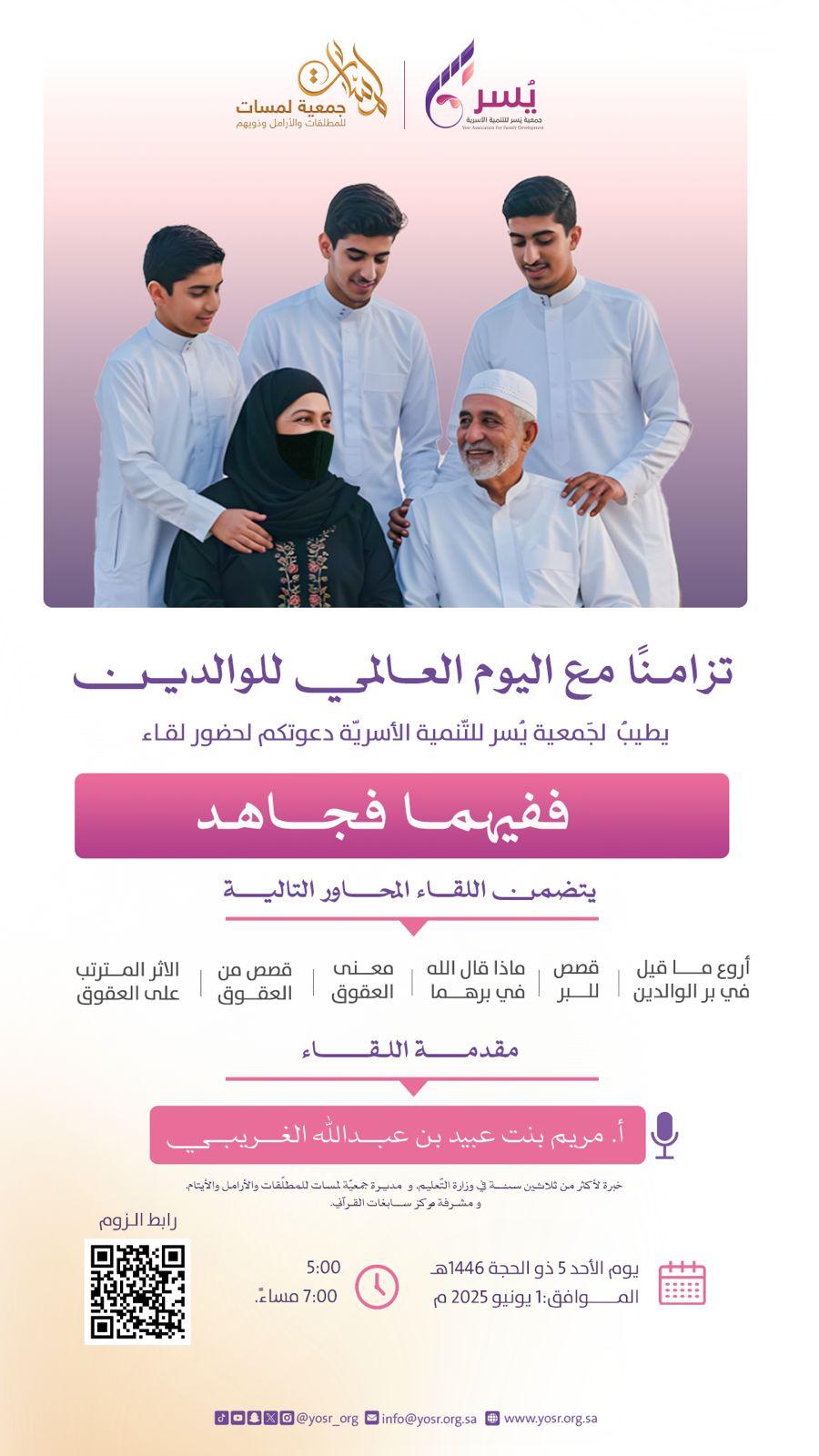 ضمن الأنشطة والبرامج والفعاليات التي تقوم بها جمعية يسر للتنمية الأسريّة بمكة المكرمة وتزامنًا مع اليوم العالمي للوالدين، تقيم الجمعية لقاء بعنوان : “ففيهما فجاهد”.