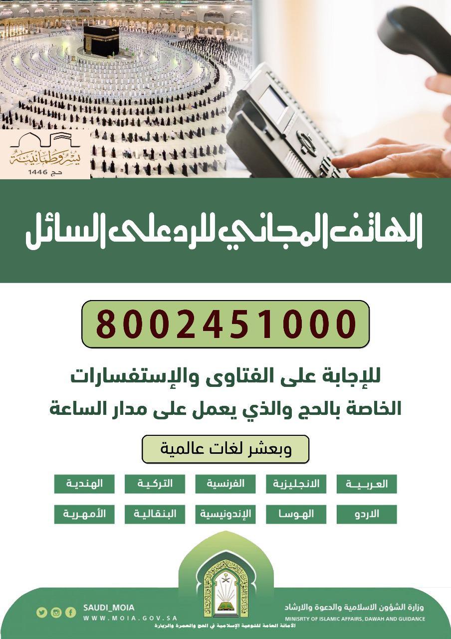 وزارة الشؤون الإسلامية والدعوة والإرشاد تدعوا حجاج بيت الله الحرام للاستفادة من خدمات الهاتف المجاني الذي يعمل على مدار الساعة للرد على استفساراتهم وتقديم الفتاوى الشرعية بعشر لغات عالمية ضمن جهودها المتواصلة لخدمة ضيوف الرحمن بالحج.