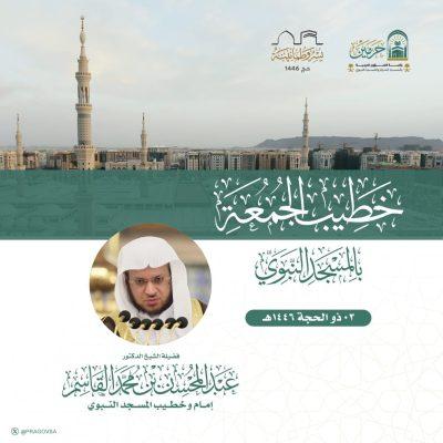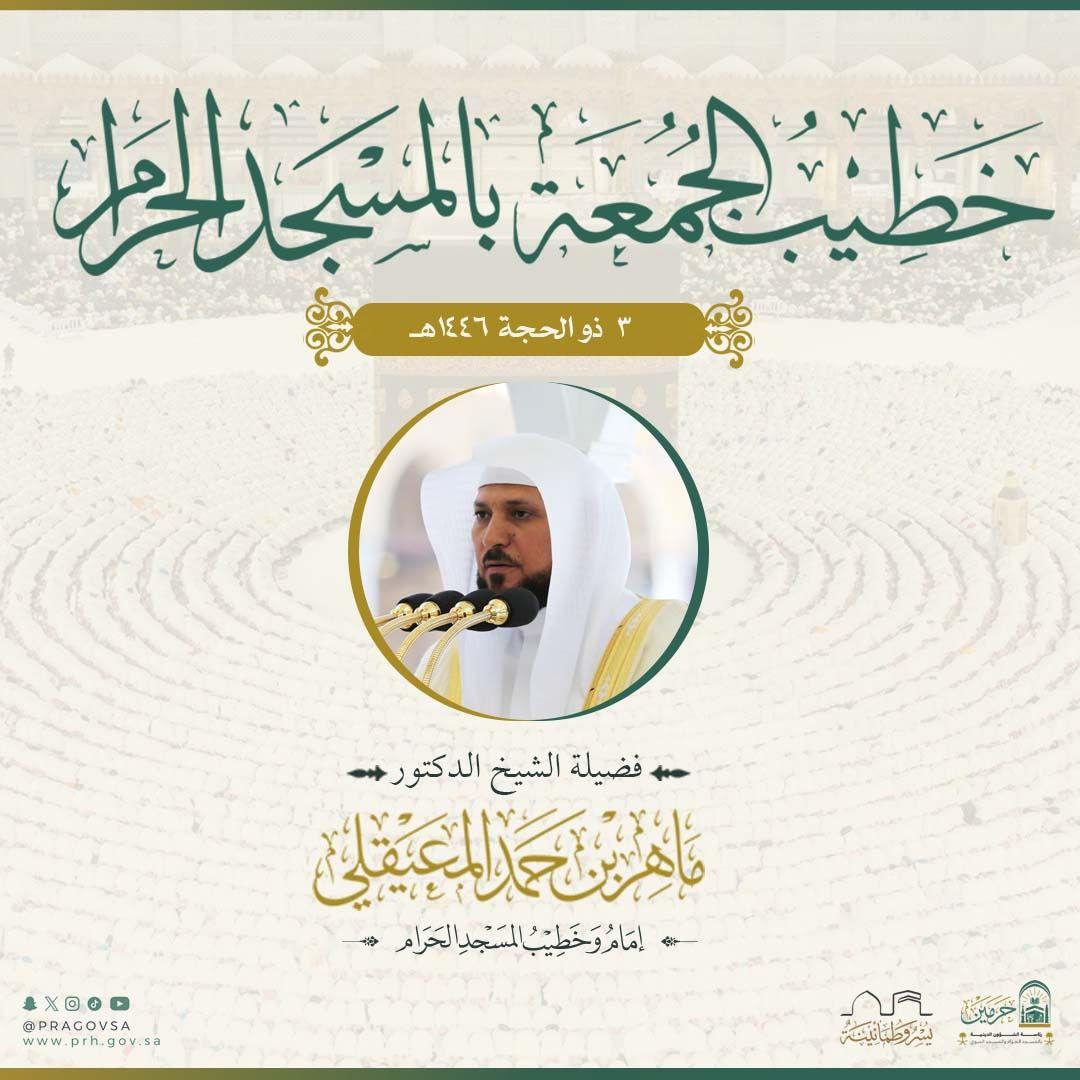 حددت رئاسة الشؤون الدينية بالمسجد الحرام والمسجد النبوي إماما وخطيبا يوم بعد غد الجمعة الموافق 3 ذو الحجة 1446هـ في الحرمين الشريفين.