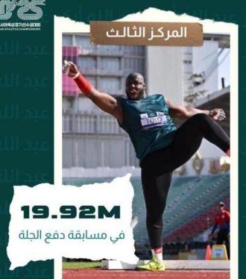 الرامي السعودي محمد تولو يحقق المركز الثالث والميدالية البرونزية في مسابقة دفع الجلة، بعد أن سجّل رمية بلغت 19.92 متر في منافسة قوية ومثيرة ، وذلك في بطولة اسيا الـ26 في جومي بكوريا الجنوبية، ويعد تولو صاحب الرقم الآسيوي والسعودي في هذه المسابقة بمسافة قدرها 20,80 م وقد شارك تولو يوم امس مع 15 لاعبًا يمثلون دول قارة اسيا.