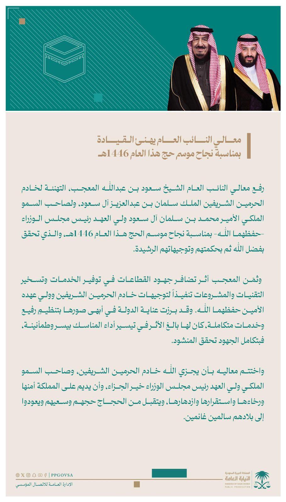 رفع معالي النائب العام الشيخ سعود بن عبدالله المعجب، التهنئة لخادم الحرمين الشريفين الملك سلمان بن عبدالعزيز آل سعود، ولصاحب السمو الملكي الأمير محمد بن سلمان آل سعود ولي العهد رئيس مجلس الوزراء -حفظهما الله- بمناسبة نجاح موسم الحج هذا العام 1446هـ، والذي تحقق بفضل الله ثم بحكمة وتوجيهات القيادة الرشيدة.