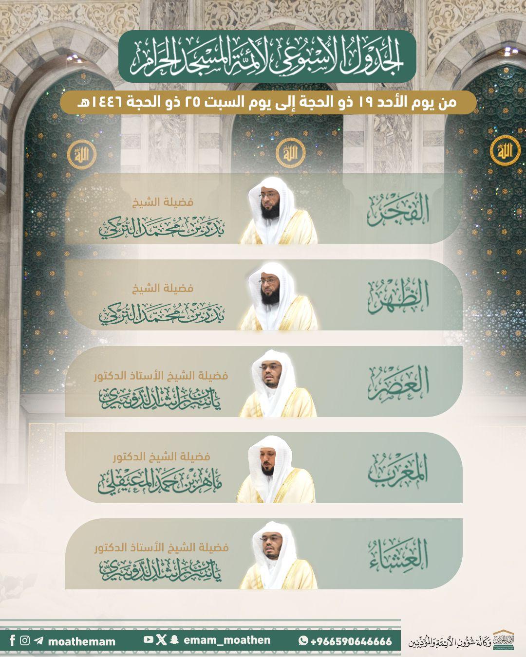 أوضحت رئاسة الشؤون الدينية بالمسجد الحرام والمسجد النبوي عن جدول الأئمة المكلفين بإمامة الصلوات للفترة من يوم الأحد 19 ذو الحجة حتى يوم السبت 25 ذو الحجة 1446هـ.