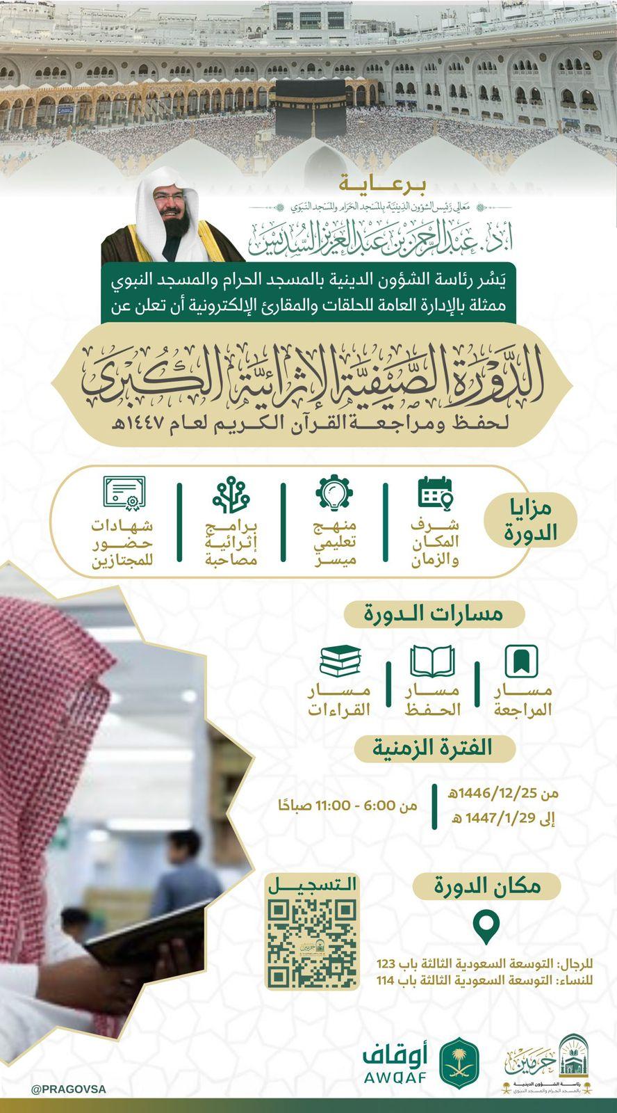 تنظم رئاسة الشؤون الدينية بالمسجد الحرام ممثلةً بالإدارة العامة للحلقات والمقارئ الإلكترونية الدورة الصيفية الإثارية الكبرى لحفظ ومراجعة القرآن الكريم لعام ١٤٤٧هـ برعاية معالي رئيس الشؤون الدينية بالمسجد الحرام والمسجد النبوي الشيخ الدكتور عبدالرحمن السديس، خلال الفترة من ١٤٤٦/١٢/٢٥هـ إلى ١٤٤٧/١/٢٩هـ، والمقامة بالمسجد الحرام في التوسعة السعودية الثالثة بجوار باب ١٢٣