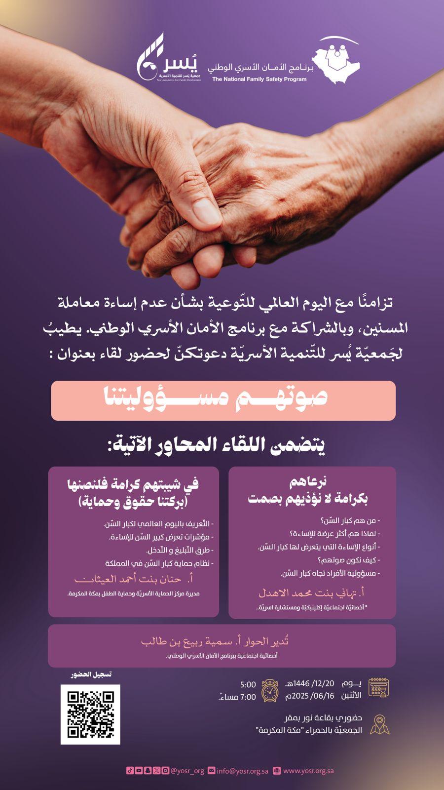 ضمن الأنشطة والبرامج والفعاليات التي تقوم بها جمعية يسر للتنمية الأسريّة بمكة المكرمة وتزامنًا مع اليوم العالمي للتّوعية بشأن عدم إساءة معاملة المسنين، وبالشراكة مع برنامج الأمان الأسري الوطني تقيم الجمعية لقاء : بعنوان (صوتهم مسؤوليتنا).