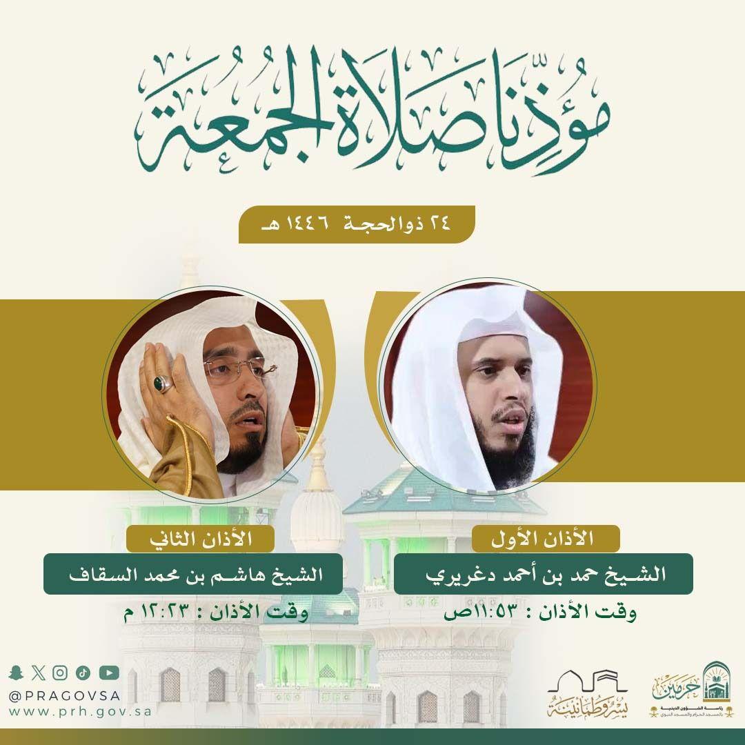 أوضحت رئاسة الشؤون الدينية بالمسجد الحرام والمسجد النبوي أسماء المؤذنين لصلاة الجمعة الموافق 24 ذي الحجة 1446هـ وذلك ضمن جهودها المستمرة في تنظيم أوقات الصلاة، وإعلام قاصدي وزوّار الحرمين الشريفين بمواعيد الأذان والمؤذنين المكلفين.